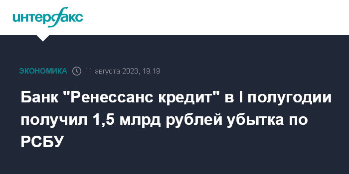 Москва. 11 августа. INTERFAX.RU - Банк "Ренессанс кредит" в первом полугодии 2023 года получил 1,5 млрд рублей чистого убытка по РСБУ, следует из отчета кредитной организации.