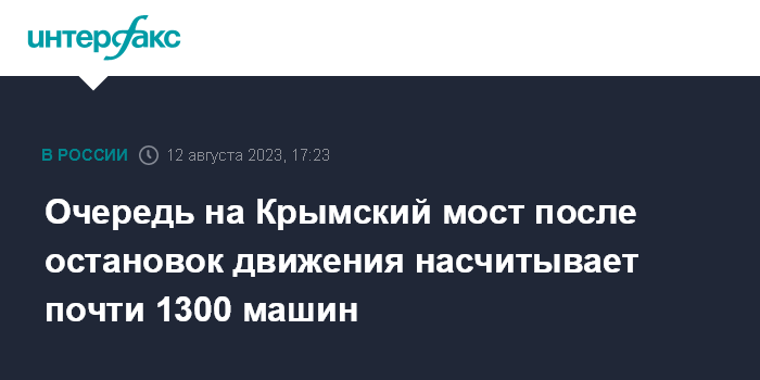 Москва. 12 августа. INTERFAX.RU - В очередях перед обязательным досмотром на Крымский мост с двух сторон скопилось 1272 автомобиля после двух перекрытий движения из-за ракетных атак, сообщает телеграм-канал, освещающий ситуацию на автомобильных подходах к мосту.