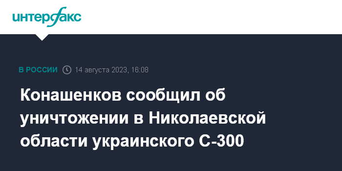 Москва. 14 августа. INTERFAX.RU - Российские военные поразили батарею украинского зенитного комплекса ПВО С-300 в Николаевской области, сообщил официальный представитель Минобороны РФ Игорь Конашенков.