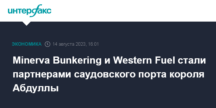 Москва. 14 августа. INTERFAX.RU - Администрация порта короля Абдуллы (King Abdullah, Саудовская Аравия) подписала соглашение о стратегическом партнерстве с бункеровочными компаниями Minerva Bunkering и Western Fuel для обеспечения поставок судового топлива, сообщает сайт порта.