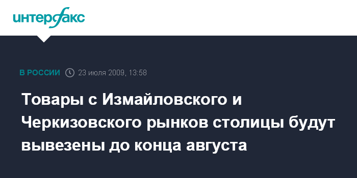 Москва. 23 июля. INTERFAX.RU - Торговцы вывезут все товары с закрытого Измайловского рынка Москвы до конца августа, сообщил журналистам глава управы района "Измайлово" Сергей Чеблаков в четверг.