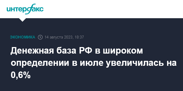 Москва. 14 августа. INTERFAX.RU - Денежная база РФ в широком определении в июле 2023 года увеличилась на 149,6 млрд рублей, или на 0,6%, до 25 трлн 78,8 млрд рублей. Данные опубликованы на сайте Банка России.