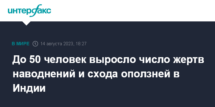 Москва. 14 августа. INTERFAX.RU - Число погибших в результате сильного наводнения и схода оползней на севере Индии выросло до 50 человек, сообщает газета The Times of India со ссылкой на местные власти.