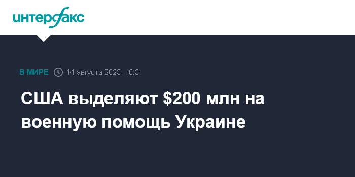 Москва. 14 августа. INTERFAX.RU - Соединенные Штаты Америки выделяют новый пакет военной помощи Украине объемом $200 млн, говорится в заявлении госсекретаря США Энтони Блинкена, опубликованном в понедельник на сайте Госдепартамента.