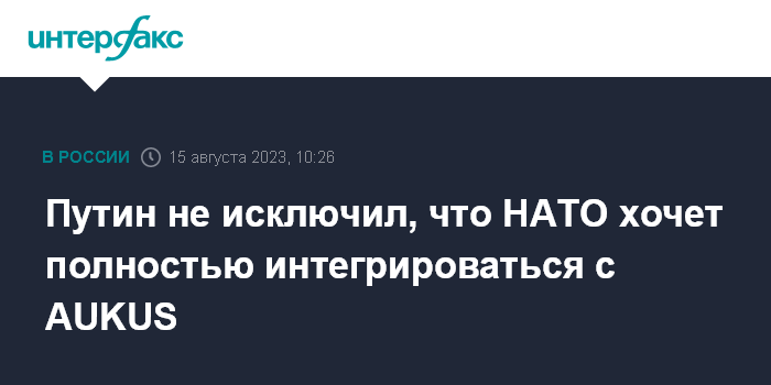 Москва. 15 августа. INTERFAX.RU - НАТО собирается полностью интегрироваться с блоком AUKUS (Австралия, Великобритания, США), заявил президент РФ Владимир Путин.