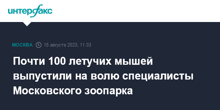Москва. 15 августа. INTERFAX.RU - Специалисты центра реабилитации рукокрылых Московского зоопарка за последний месяц выходили и отпустили на волю практически 100 летучих мышат, сообщается в телеграм-канале зоопарка.