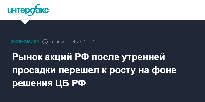Москва. 15 августа. INTERFAX.RU - Рынок акций РФ после утренней просадки перешел к умеренному росту по факту объявления о повышении ключевой ставки ЦБ РФ сразу на 350 базисных пунктов (до 12% годовых) на внеочередном заседании регулятора 15 августа. При этом российский рубль, заметно укреплявшийся до заседания ЦБ, сократил свой рост к доллару США и оказался вблизи уровня 97,15 руб./$1 (-0,51 рубля к закрытию понедельника).