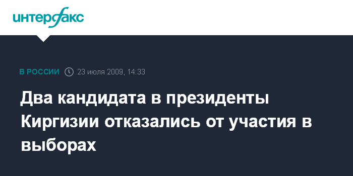 Москва. 23 июля. INTERFAX.RU - Два кандидата в президенты Киргизии отказались от участия в выборах. Единый оппозиционный кандидат в президенты Киргизии Алмазбек Атамбаев и другой кандидат Женишбек Назралиев заявили об отказе участвовать в выборах, так как считают их нелегитимными.