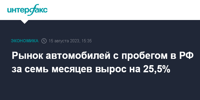 Москва. 15 августа. INTERFAX.RU - Продажи автомобилей с пробегом в РФ в январе-июле 2023 года выросли на 25,5%, до 3,265 млн единиц, сообщило агентство "Автостат".