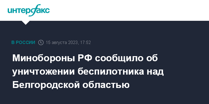 Москва. 15 августа. INTERFAX.RU - Минобороны РФ сообщило, что над территорией Белгородской области сбит украинский беспилотник.