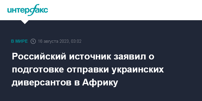 Москва. 16 августа. INTERFAX.RU - Российский военно-дипломатический источник сообщил, что есть данные о планах переброски в Африку отряда украинских диверсантов.