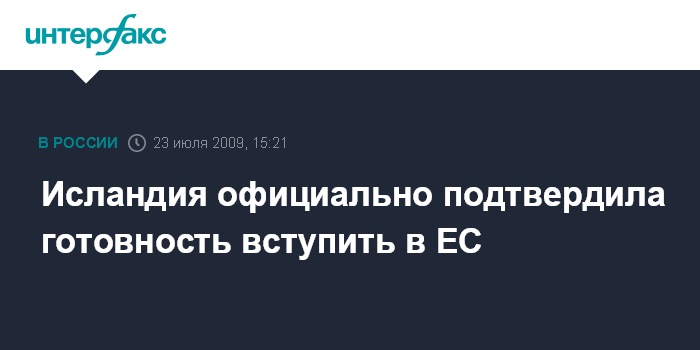 Москва. 23 июля. INTERFAX.RU - Исландия через неделю после принятия парламентского решения формально подтвердила готовность вступить в Евросоюз, сообщила британская телерадиокорпорация BBC. Об этом на встрече с главой МИД председательствующей в ЕС Швеции Карлом Бильдтом заявил в четверг в Стокгольме министр иностранных дел Исландии Оссур Скарфединссон. Со своей стороны, Бильдт отметил, что вступление Исландии в Евросоюз укрепит позиции скандинавских стран в ЕС.
