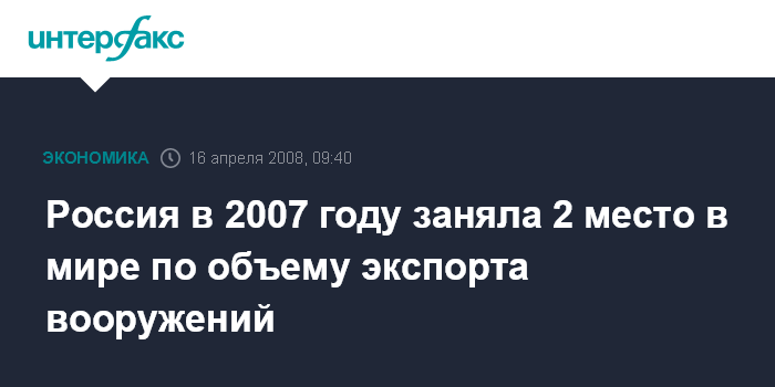 Россия в 2007 году заняла 2 место в мире по объему экспорта вооружений