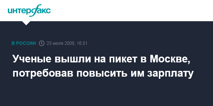 Москва. 23 июля. INTERFAX.RU - Профсоюзные организации, представляющие интересы работников научных учреждений, провели акцию с требованием в 5-10 раз повысить зарплату научных работникам. Акция в форме пикета была проведена в четверг днем на пл.Яузские Ворота, сообщил "Интерфаксу" председатель Российского координационного совета профсоюзных организаций научных работников и государственных научных центров Анатолий Миронов. По его словам, на акцию вышли около 100 человек - представители профсоюза Российской академии наук, общественной организации "За возрождение отечественной науки", а также профсоюзных организаций научных центров. Одно из основных требований, которые были выдвинуты в ходе акции, связано с необходимостью повышения зарплат научным работникам. Кроме того, ученые настаивают на том, что "пропорции бюджетного финансирования науки должны быть на уровне наиболее развитых стран мира".