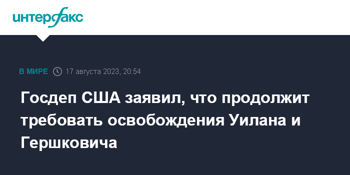 Москва. 17 августа. INTERFAX.RU - Вашингтон продолжает настаивать на освобождении граждан США Пола Уилана и Эвана Гершковича, заявил представитель госдепа Ведант Патель.