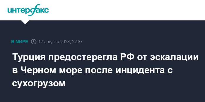 Москва. 17 августа. INTERFAX.RU - В Турции призвали Россию воздержаться от любых действий, которые могут привести к эскалации в Черном море, сообщают турецкие СМИ со ссылкой на Управление президента Турции по коммуникациям.
