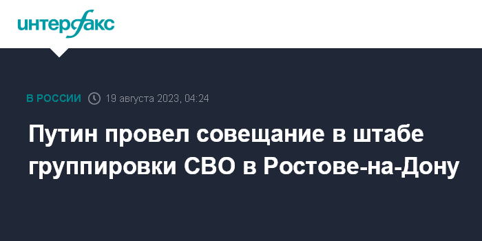 Москва. 19 августа. INTERFAX.RU - Президент РФ Владимир Путин провел совещание в штабе группировки СВО в Ростове-на-Дону, сообщили в Кремле.