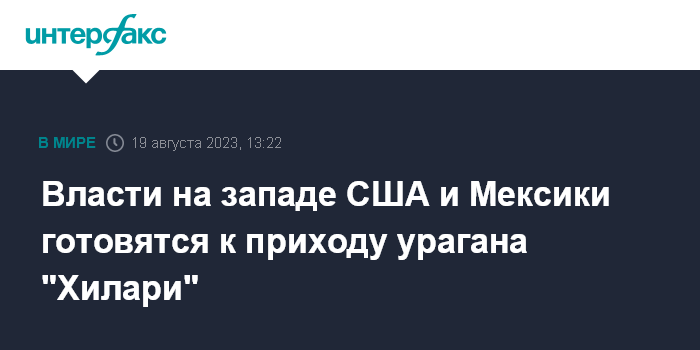 Москва. 19 августа. INTERFAX.RU - Власти американского штата Калифорния, а также запада Мексики ведут подготовительные мероприятия в связи с приближением урагана "Хилари", сообщает в субботу Associated Press.