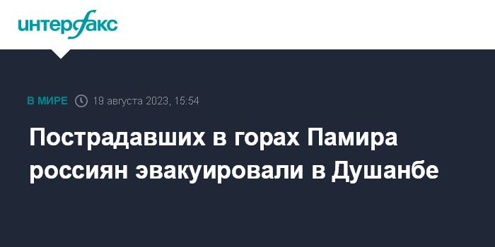 Москва. 19 августа. INTERFAX.RU - Группа российских альпинистов, пострадавших в ходе прохождения туристического спортивного маршрута в горах Памира, была экстренно эвакуирована из базового лагеря и доставлена в Душанбе, сообщила в субботу пресс-служба российского посольства в Таджикистане.