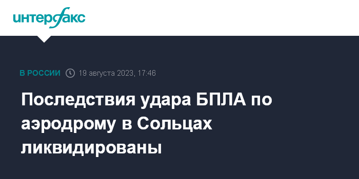 Москва. 19 августа. INTERFAX.RU - Последствия удара украинского БПЛА в субботу по военному аэродрому в новгородском городе Сольцы ликвидированы, заявил глава Солецкого района Максим Тимофеев.