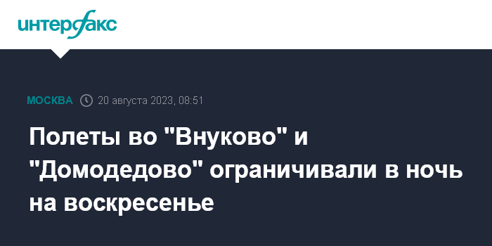 Москва. 20 августа. INTERFAX.RU - Работа московских аэропортов "Внуково" и "Домодедово" ограничивалась в ночь на воскресенье из соображений безопасности, сообщили в Росавиации журналистам.