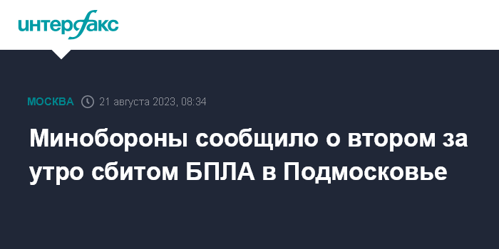 Москва. 21 августа. INTERFAX.RU - Силы ПВО в Подмосковье сбили второй за утро беспилотник, сообщило Министерство обороны России.
