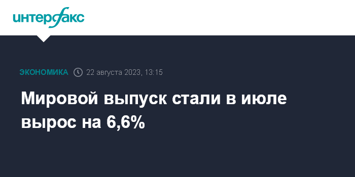 Москва. 22 августа. INTERFAX.RU - Производство стали в 63 странах мира, предоставляющих данные во Всемирную ассоциацию стали (World Steel Association), в июле 2023 года увеличилось на 6,6% по сравнению с аналогичным периодом 2022 года, до 158,5 млн тонн, сообщила организация.