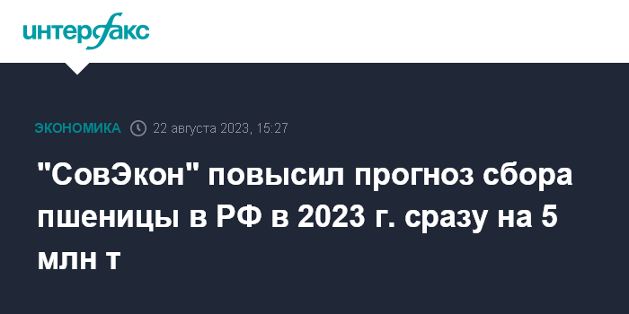 "СовЭкон" повысил прогноз сбора пшеницы в РФ в 2023 г. сразу на 5 млн т