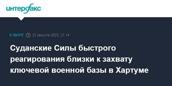 Москва. 22 августа. INTERFAX.RU - Военизированные Силы быстрого реагирования (СБР) разместили видеозаписи, которые могут свидетельствовать о том, что СБР вскоре возьмут под контроль важнейший объект суданских военных - базу бронетанковых сил на юге Хартума, сообщает во вторник The National News.