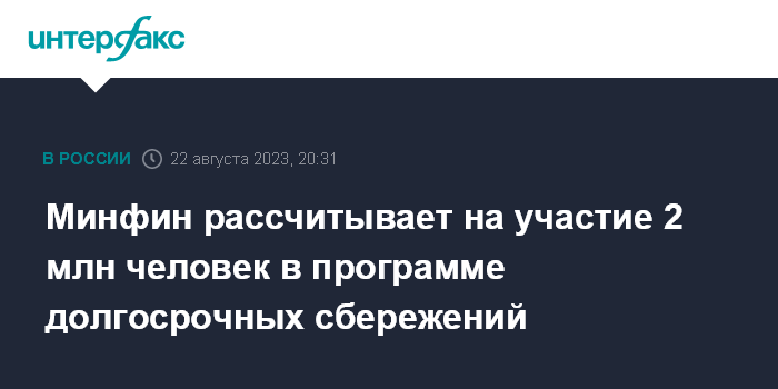 Москва. 22 августа. INTERFAX.RU - Минфин РФ ожидает, что участниками программы долгосрочных сбережений в скором времени после ее запуска станут 2 млн человек, она позволит привлечь 300 млрд рублей дополнительных ресурсов, заявил министр финансов Антон Силуанов.