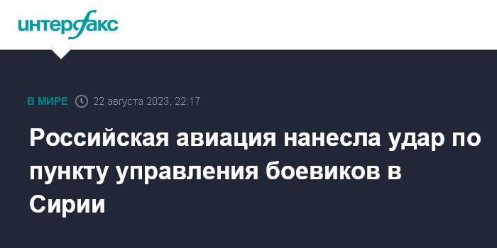 Москва. 22 августа. INTERFAX.RU - Самолеты ВКС России в Сирии нанесли удар по пункту управления террористической организации "Хайат Тахрир аш-Шам" (запрещена в РФ), сообщил замруководителя российского Центра по примирению враждующих сторон (ЦПВС) в САР контр-адмирал Вадим Кулить.