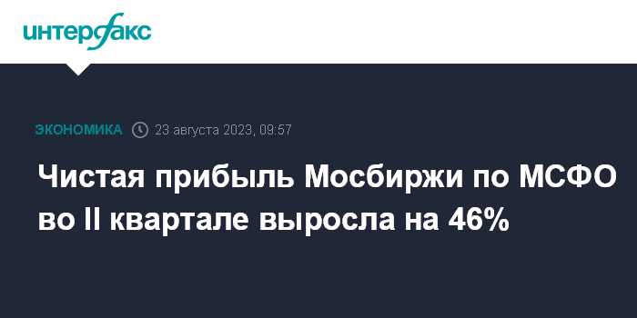 Москва. 23 августа. INTERFAX.RU - "Московская биржа" по итогам второго квартала получила 12,11 млрд рублей чистой прибыли по МСФО, что на 46,2% больше, чем за аналогичный период 2022 года (8,286 млрд рублей), говорится в отчете торговой площадки.