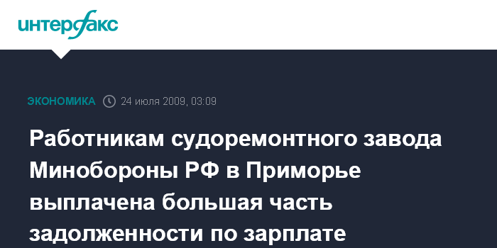 Владивосток. 24 июля. ИНТЕРФАКС-ДАЛЬНИЙ ВОСТОК - Минобороны РФ погасило большую часть задолженности по зарплате перед работниками 30-го судоремонтного завода (СРЗ) в поселке Дунай Приморского края. С 20 июля около 60 специалистов этого предприятия отказались выходить на работу из-за отсутствия денег.