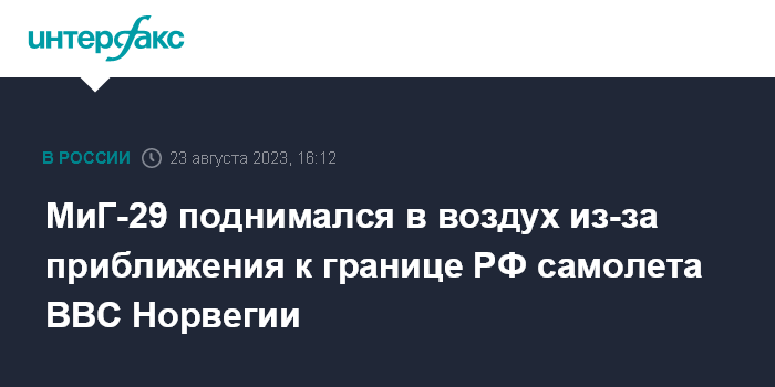 Москва. 23 августа. INTERFAX.RU - Российские военные сообщили, что истребитель МиГ-29 Северного флота поднимался в воздух из-за приближения к границе РФ самолета ВВС Норвегии.