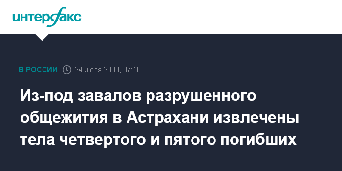 Ростов-на-Дону. 24 июля. ИНТЕРФАКС-ЮГ - Спасатели извлекли из под завалов разрушенного общежития в Астрахани тело молодой женщины и ее супруга, сообщили агентству "Интерфакс-Юг" в пресс-центре Южного регионального центра МЧС РФ.