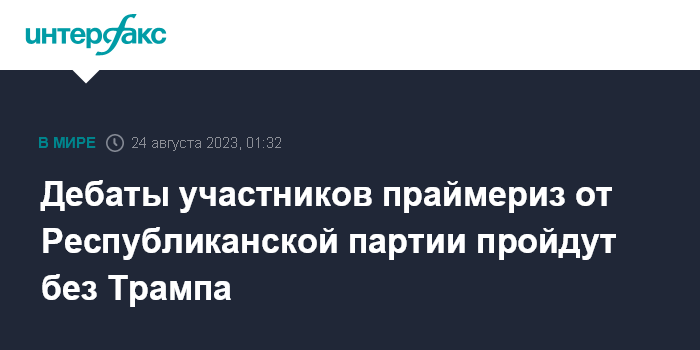 Москва. 24 августа. INTERFAX.RU - Участники праймериз от Республиканской партии США примут участие в первых в рамках президентской гонки 2024 года теледебатах.
