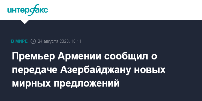 Москва. 24 августа. INTERFAX.RU - Ереван передал Баку новые предложения по мирному соглашению, сообщил премьер-министр Армении Никол Пашинян.