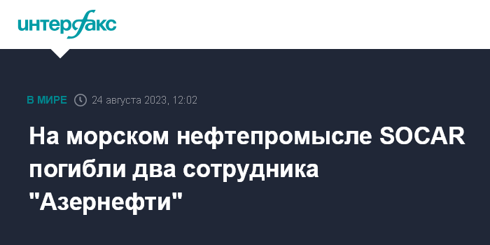 Москва. 24 августа. INTERFAX.RU - Двое сотрудников производственного объединения "Азнефть" (структура компании SOCAR по добыче нефти и газа - ИФ) погибли в результате несчастного случая в ходе ремонтных работ в море, сообщает азербайджанское агентство Report.