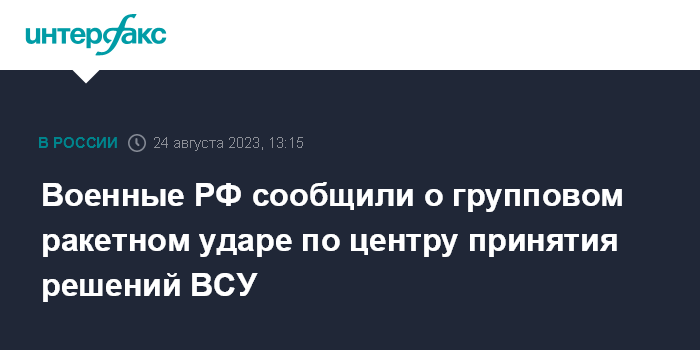 Москва. 24 августа. INTERFAX.RU - Российские военные ночью нанесли групповой ракетный удар высокоточным морским и наземным оружием большой дальности по центру принятия решений Вооруженных сил Украины (ВСУ), заявил официальный представитель Минобороны РФ Игорь Конашенков.