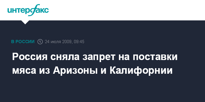 Москва. 24 июля. INTERFAX.RU - Россия сняла запрет на поставки мяса всех видов из американских штатов Аризона и Калифорния, введенный в связи с регистрацией в них гриппа H1N1.