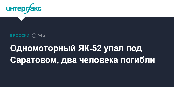 Москва. 24 июля. INTERFAX.RU - Два человека погибли при крушении легкомоторного самолета под Саратовом.