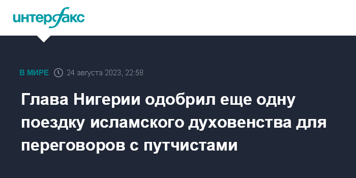 Москва. 24 августа. INTERFAX.RU - Президент Нигерии Бола Тинубу в четверг дал добро на возвращение в Нигер делегации исламского духовенства для переговоров с военными, устроившими путч 26 июля, сообщили местные СМИ.