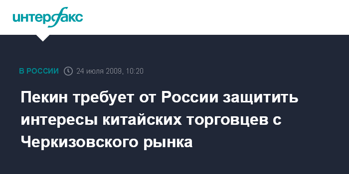 Москва. 24 июля. INTERFAX.RU - Китай призвал российские власти защитить интересы китайских торговцев, работавших на Черкизовском рынке.
