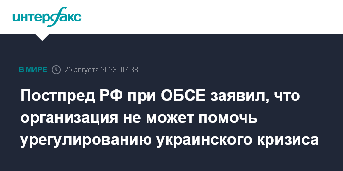 Москва. 25 августа. INTERFAX.RU - Организация по безопасности и сотрудничеству в Европе (ОБСЕ) не сможет стать площадкой для урегулирования конфликта на Украине, заявил постоянный представитель РФ при ОБСЕ Александр Лукашевич в интервью, опубликованном в пятницу в газете "Известия".