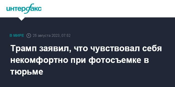 Москва. 25 августа. INTERFAX.RU - Бывший президент США Дональд Трамп заявил телеканалу Fox News, что чувствовал себя некомфортно, когда в тюрьме округа Фултон штата Джорджия его вынудили фотографироваться.