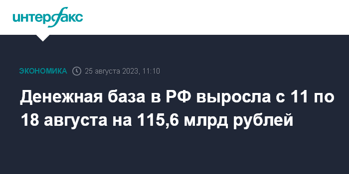 На 11 августа денежная база в России равнялась 18 604,1 млрд рублей. Таким образом, за период она выросла на 0,62%, или на 115,6 млрд рублей.