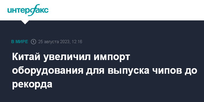 Москва. 25 августа. INTERFAX.RU - Китай увеличил импорт оборудования для производства полупроводниковых компонентов до рекордного уровня в преддверии вступления в силу экспортных ограничений со стороны Японии и Нидерландов, пишет газета Financial Times.