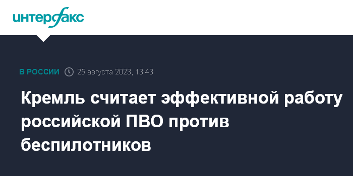 Москва. 25 августа. INTERFAX.RU - Российские средства противовоздушной обороны эффективно противодействуют террористическим атакам на российскую территорию украинских беспилотников, заявил пресс-секретарь президента Дмитрий Песков.