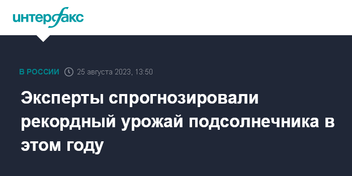 Москва. 25 августа. INTERFAX.RU - Урожай подсолнечника в РФ в этом году может стать рекордным и достичь 16,596 млн тонн против 16,357 млн тонн в прошлом году. Об этом сообщается в презентации компании "ПроЗерно", размещенной в телеграм-канале "Сельский час".