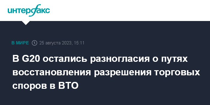 Москва. 25 августа. INTERFAX.RU - Министры торговли G20 подтвердили важность полноценного восстановления системы разрешения торговых споров в ВТО к 2024 году, но разногласия по путям достижения этой цели сохраняются, заявило российское Минэкономразвития.